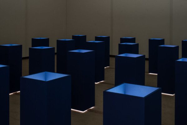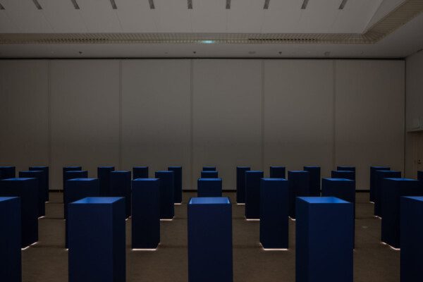 Installation of 90 A4-sized lithophanes on wooden plinths, backlit.