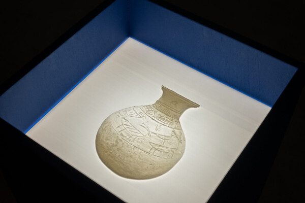 The “Stolen Past” installation consists of a series of 90 backlit ‘lithophanes’ of the looted and destroyed pieces, based on simple photographs taken in haste on their phones by the Raqqa archaeological team when IS was at their door. When backlit, lithophanes cause an image to appear that look like a black-and-white photograph, in this case symbolising the ongoing presence of our Stolen Past.